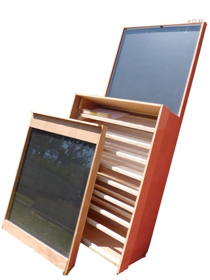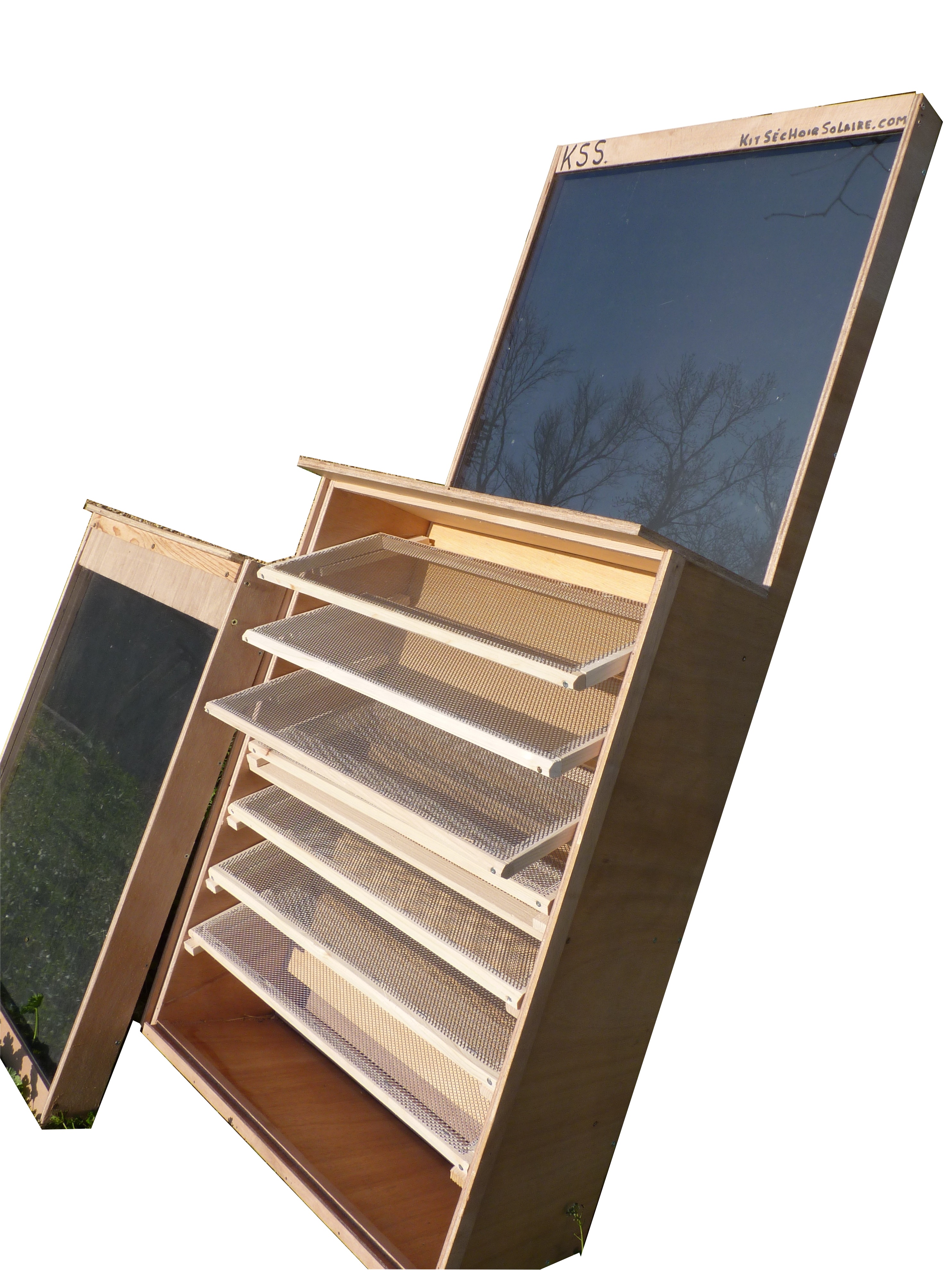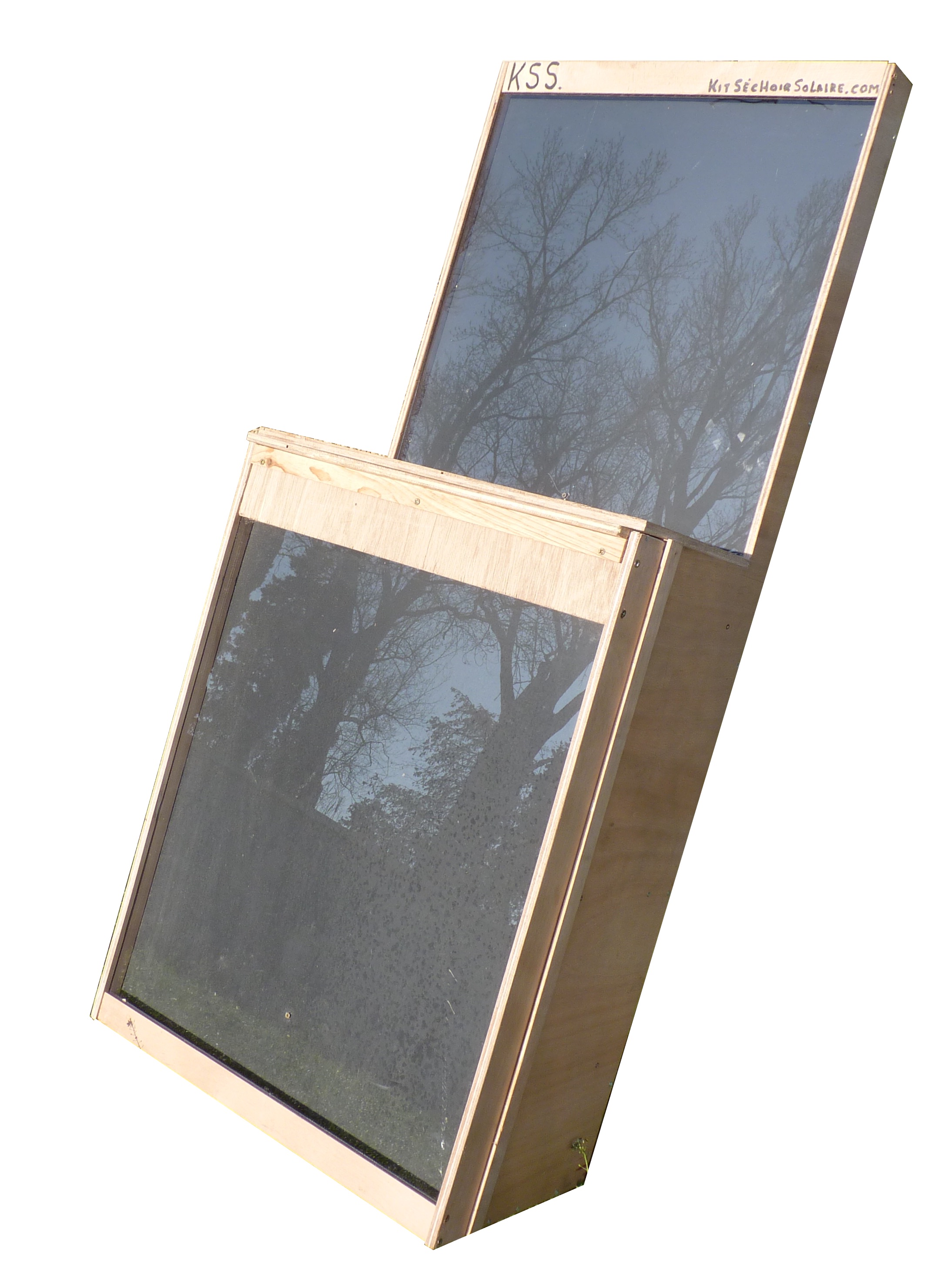Le séchoir KSS se compose de bois, de verre, et de métal (la plaque chauffante noire). Une partie séchoir et une partie cheminée qui extrait l'air chaud chargé d'humidité.